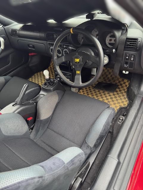 室内はOMPステアリング、レカロセミバケットシート2脚に交換されています。改造車買取専門CPSではMR-S、ロードスター、S2000などのオープンスポーツカーの改造車も多く査定、買取しています。イベント仕様、サーキット仕様、街乗り仕様など様々な改造車を高価買取‼北海道から沖縄県まで全国無料で出張査定を行っておりますので、チューニングカー、ドレスアップカーのご売却をご検討されている方がいましたら、お気軽にお問合せ下さい♪