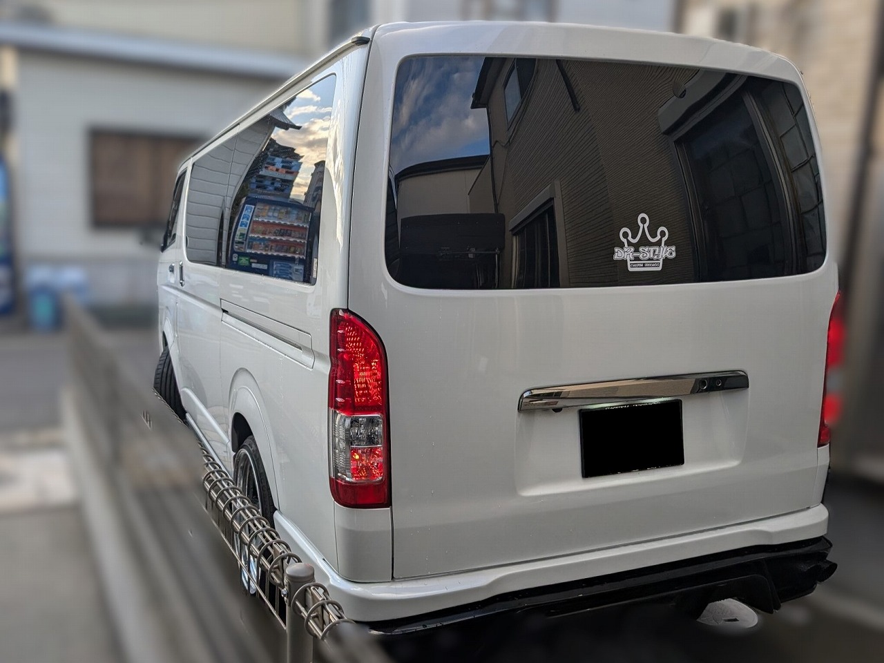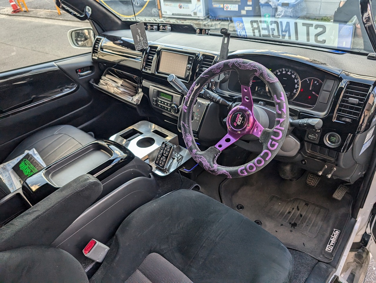 H29年式 レジアスエースバン(TRH200V) スーパーGLダークプライム オートマ 走行12.7万㎞H29年式、走行12.7万㎞のレジアスエースバン(TRH200V)のカスタムカーです。レジアスエースでは珍しくハイドロが組んであります。もちろんフェンダーやCノッチ加工も施されています。外装はSADのフロントバンパー&ボンネット、CRSの前後フェンダー、ファブレスのXR6ホイールのほかヴァレンティのヘッドライト、加工テールランプも装着されています。内装はダークプライム2の内装が移植してあり、Nスタイルのステアリング、ブリッドのセミバケに交換されています。しっかりカスタムされた改造車のため精一杯の金額をご提示し買取しました。