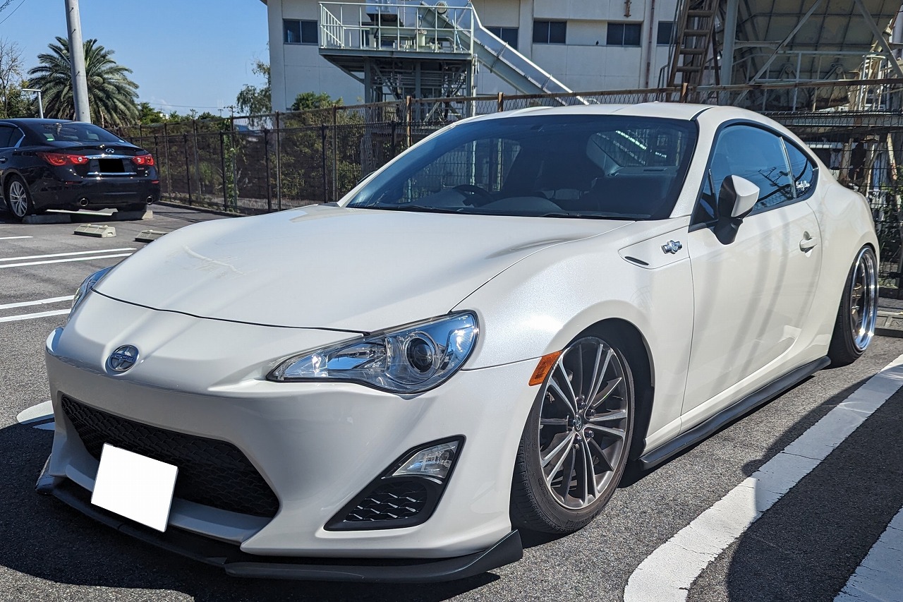 H27年式 86(ZN6) GT 6速マニュアル 走行14.1万㎞86(ZN6)GT6速マニュアル車の1オーナー車です。エンジン関係はトムスインテークパイプ、トラストマフラーに交換されていて、足回りに326パワーの車高調を組み、外装は社外リップ、サイドステップ、リヤアンダーを装着しマイスターホイールを履いています。フロントのホイールが純正でした全体的にスポーティに仕上げてあったため、高価買取できました。