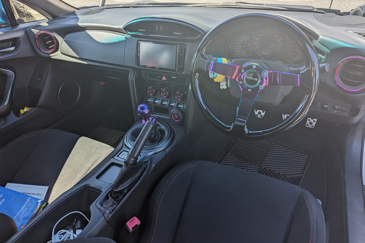 内装はステアリングが社外品に交換してあります。改造車買取専門CPSでは86、GR86、BRZの改造車も多く査定、買取しています。イベント仕様、サーキット仕様、街乗り仕様など様々な仕様を高価買取‼北海道から沖縄県まで全国無料で出張査定を行っておりますので、チューニングカー、ドレスアップカーの改造車の売却をご検討されている方がいましたら、お気軽にお問合せ下さい♪