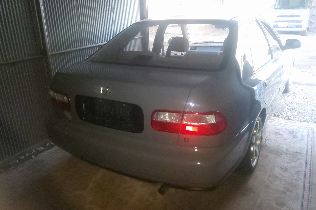 H5年式 シビックフェリオ(EG8) MX 5速マニュアル 走行14.4万㎞シビックフェリオ(EG8)の不動車の改造車です。D16Aエンジン換装、タナベ車高調、社外アーム、社外ホイール、社外ヘッドライト&テールランプなどに交換してあり、外装はグレー、エンジンルームはオレンジに塗装されています。エンジンが掛からない不動車でしたが、改造内容など考慮し買取しました。CPSでは不動車、事故車などの改造車も積極的に買取しています。