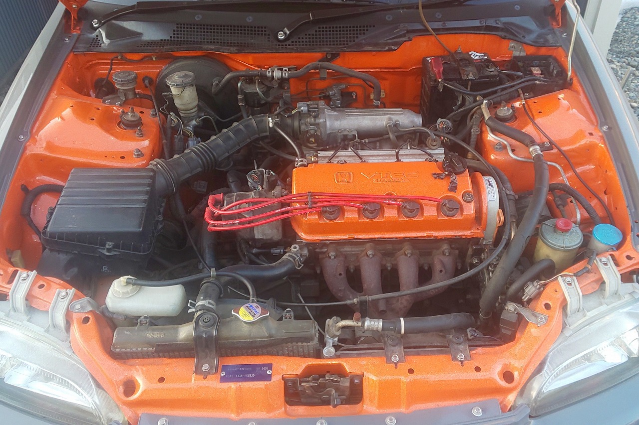 エンジンルームはオレンジに塗装してあり、D16Aエンジンに乗せ換えてあります。