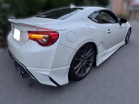 H29年式 86(ZN6) GT オートマ 走行15.6万㎞H29年式、86(ZN6)のオートマ車をベースにしたカスタムカーになります。エンジン関係は柿本のサクションパイプ、柿本のマフラーに交換してあり、足回りは車高調、スキッドレーシングのロアアームが装着されています。外装はDIYにて塗装された部分がありますが、TRDやモデリスタのエアロパーツが組みグラムライツのホイールを履いています。走行距離は15万㎞を超えていますがエンジンなどの機関の状態が良い改造車のため、オートマ車でも高価買取できました。