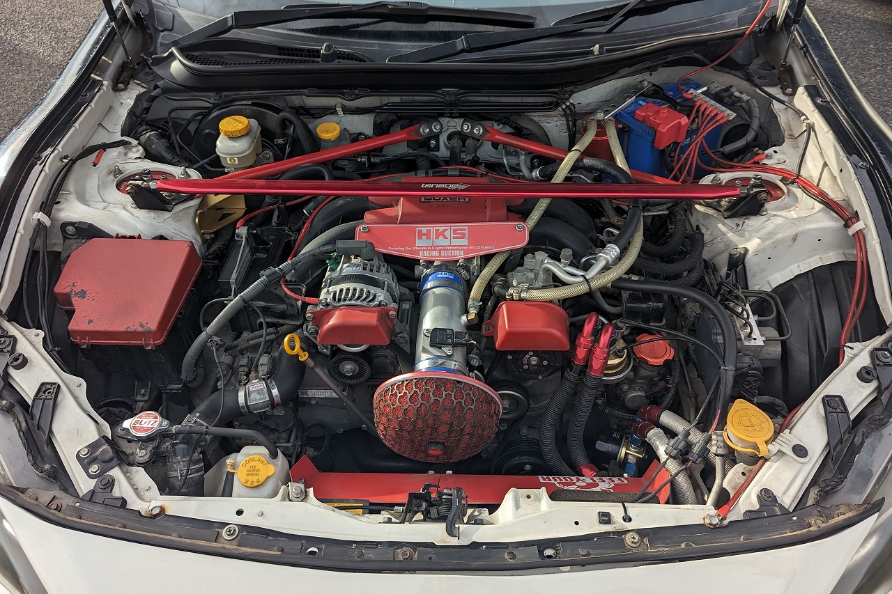エンジン関係はHKSエアクリ&サクションパイプ、HKSエキマニ、アペックスマフラーを装着し吸排気チューンが鉾越されています。HPIのオイルクーラーも装着されています。