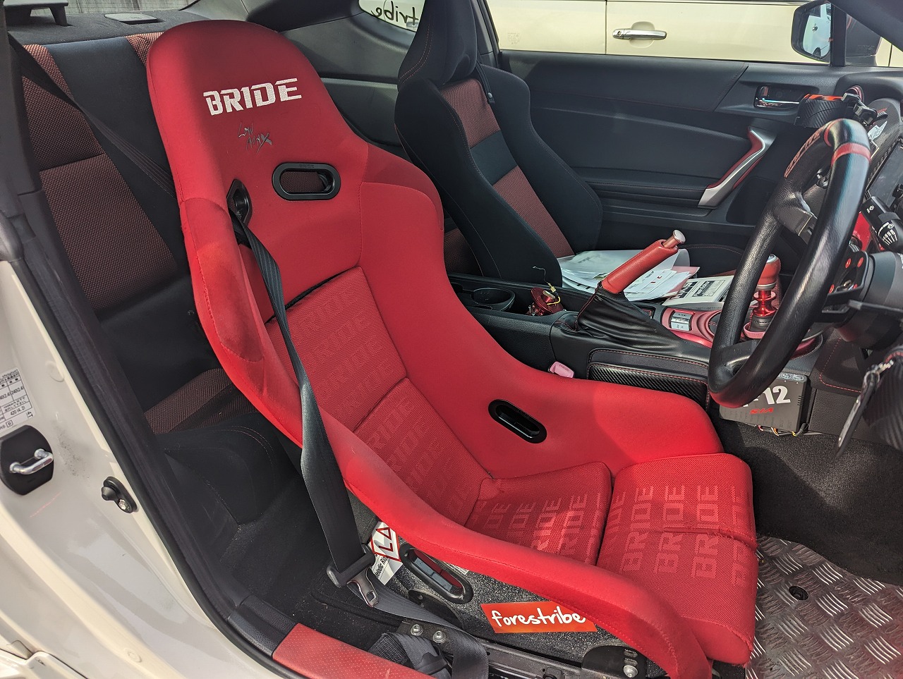 ブリッドのフルバケ、MOMOステアリングに交換されています。画像だとわかりにくいですが、デフィの追加メーターも装着されています。