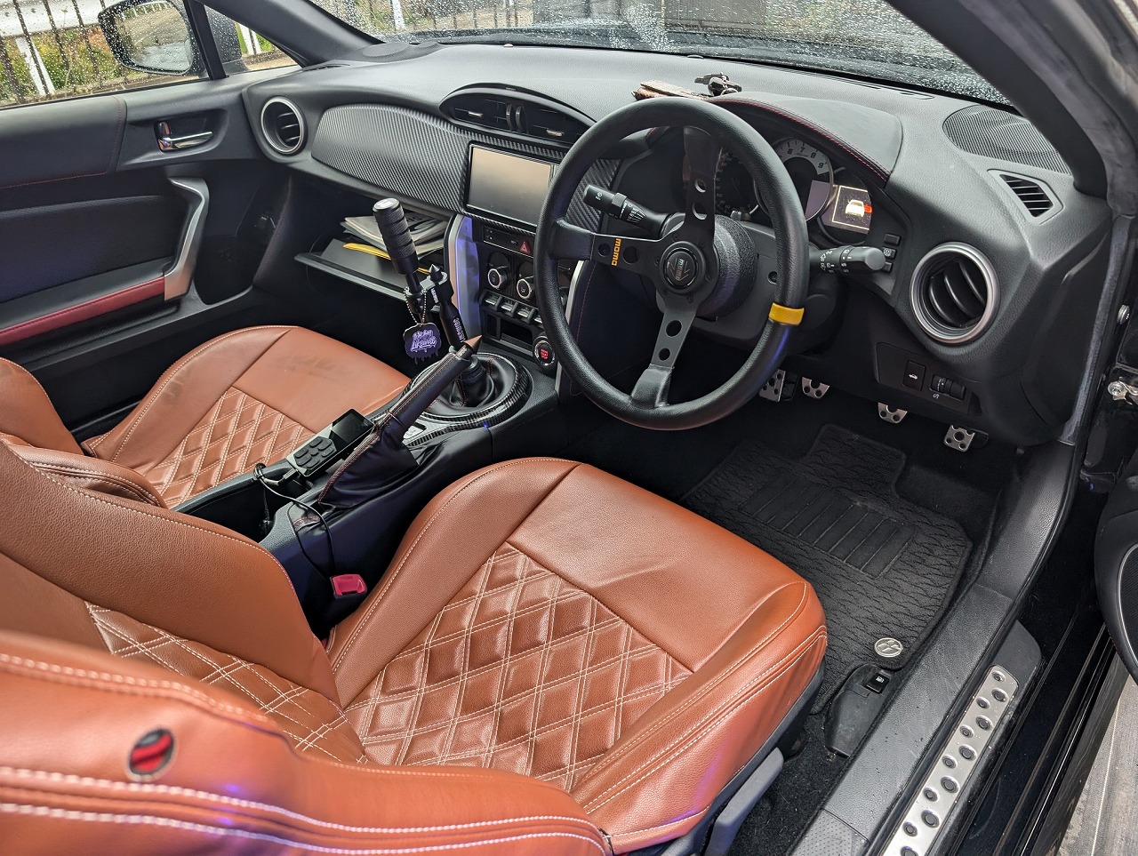 内装はシートカバー、MOMOのステアリングが装着されています。改造車買取専門CPSではチューニング&ドレスアップした86、GR86、BRZを積極的に査定、買取しています。街乗り仕様、サーキット仕様、イベント仕様など様々な改造車を高価買取‼北海道から沖縄県まで全国無料で出張査定を行っておりますので、チューニングカー、ドレスアップカーのご売却をご検討されている方がいましたら、お気軽にお問合せ下さい♪