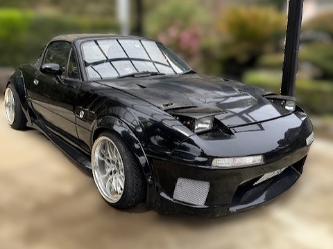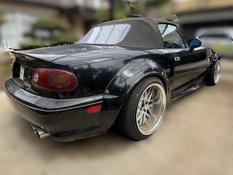 H6年式 ロードスター(NA8C) スペシャルパッケージ 6速マニュアル 走行距離不明H6年式のロードスター(NA8C)で改造多数の不動車です。エンジンはTD05タービンを組みターボ化してあり、ミッションもオートマから6速マニュアルに変更されています。ほかにもオーリンズ車高調、社外エアロ&オーバーフェンダー、社外ホイール、社外バケットシートなど装着されています。エンジンが掛からない不動車ですが、アフターパーツの価値をプラスし買取しました。