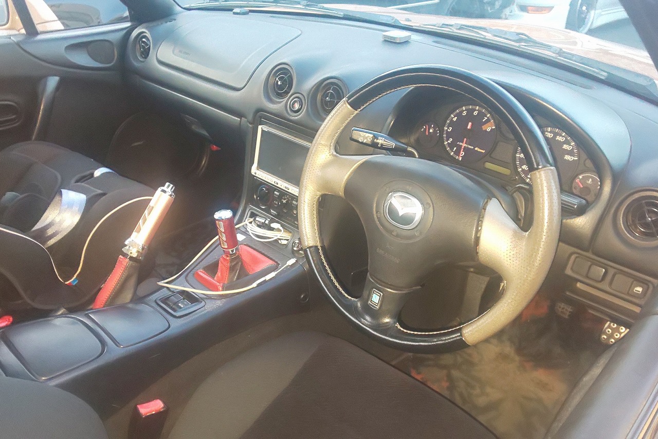 純正のナルディステアリング、社外のシフト&サイドブレーキブーツが装着されています。改造車買取専門CPSではNAからNDまでロードスターの改造車を多く査定、買取しています。イベント仕様、サーキット仕様、街乗り仕様など様々な仕様を高価買取‼北海道から沖縄県まで全国無料で出張査定を行っておりますので、チューニングカー、ドレスアップカーの改造車の売却をご検討されている方がいましたら、お気軽にお問合せ下さい♪