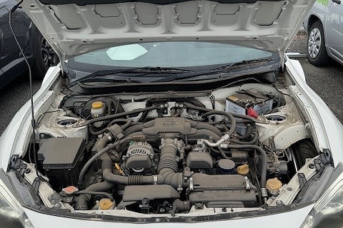 H24年式 BRZ(ZC6) S オートマ 走行5.2万BRZのオートマ車をベースにしたライトチューン車です。エンジンは純正加工したマフラーが装着されている程度で、足回りはKTSの車高調やリヤアーム類が組んであります。外装は後期バンパーに社外カーボンリップ、TRDサイドステップ&フロントフェンダーフィンなど装着されていて、内装はパネル類がホワイトに塗装されていて社外のステアリングに交換してあります。BRZ、86、GR86はマニュアル、オートマ関わらず様々なチューニングカー、ドレスアップカーを高価買中です。