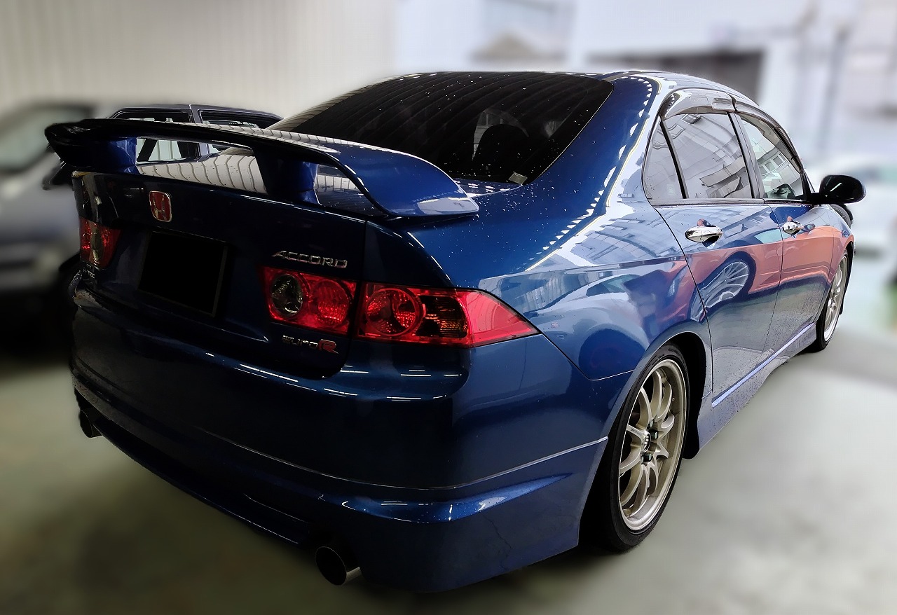 H16年式 アコード(CL7) ユーロR 6速マニュアル 走行11.1万㎞H16年式、アコード(CL7)のライトチューン車です。エンジン関係はM’s のエアクリーナー、フジツボのマフラーに交換してあり、足回りはダウンサスが組んであります。外装は社外バンパー、ムゲンのサイドステップ&リヤバンパーが装着し、ボルクのホイールを履いています。ボディに色あせなどありましたが、街乗りも快適にこなせるようなライトチューン車に仕上げてありましたので、精一杯の金額をご提示し買取しました。