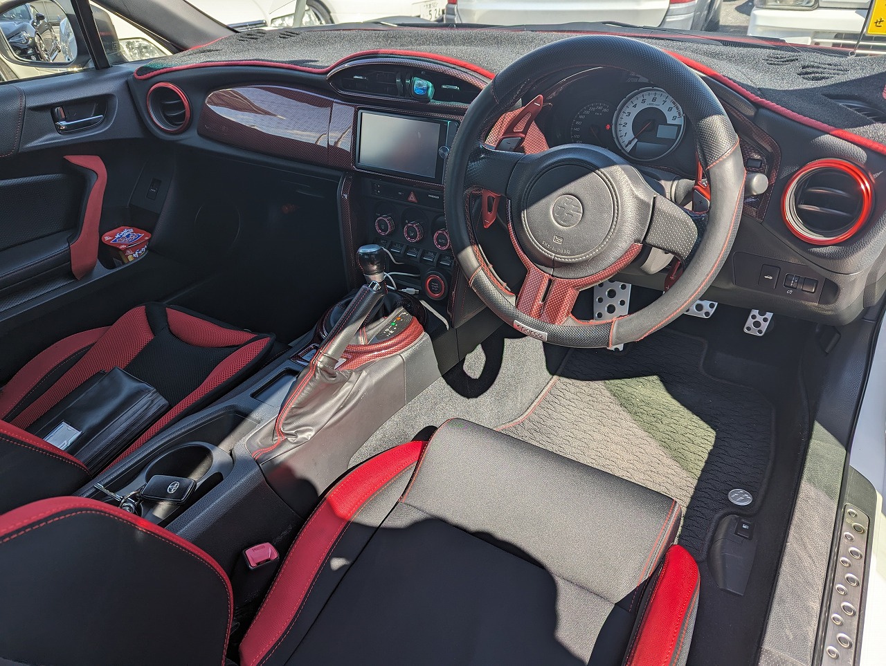 内装は左右スパルコのセミバケに交換してあります。ダッシュボードの浮きもありませんでした。改造車買取専門CPSでは86、GR86、BRZの改造車はマニュアル、オートマ問わず高価買取しています。サーキット仕様、街乗り仕様など様々な仕様を高価買取‼北海道から沖縄県まで全国無料で出張査定を行っておりますので、チューニングカー、ドレスアップカーの改造車の売却をご検討されている方がいましたら、お気軽にお問合せ下さい♪
