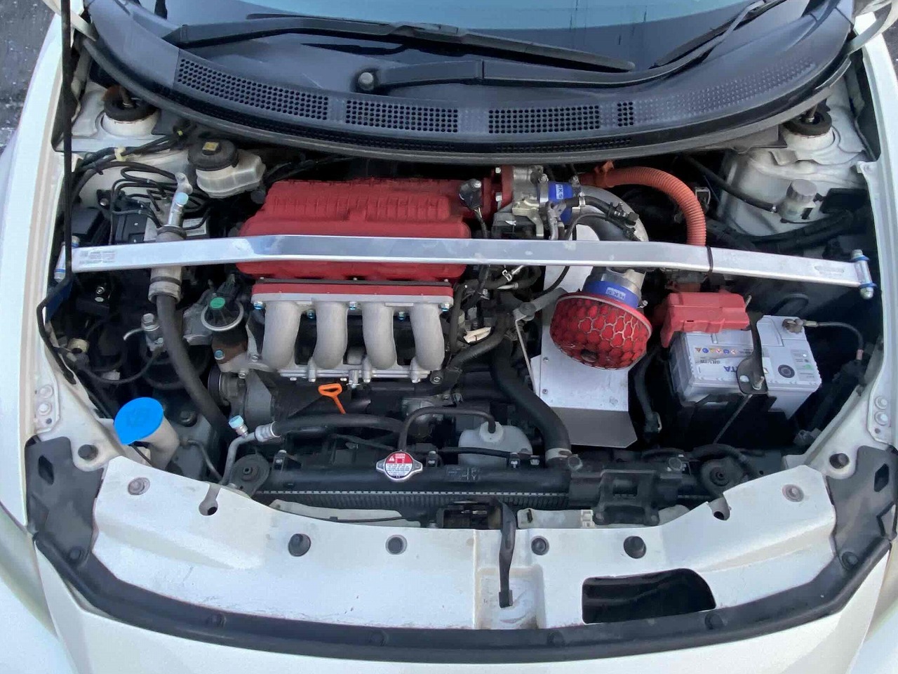 エンジンルームにはクスコのタワーバーが装着されています。エンジン関係はHKSレーシングサクション、社外マフラーに交換されています。