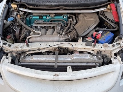 エンジン関係はJ’sレーシングのエアクリーナー、3Q自動車のマフラーに交換しJ’sレーシングのECUで制御されています。ラジエターも社外のアルミ製に交換されています。