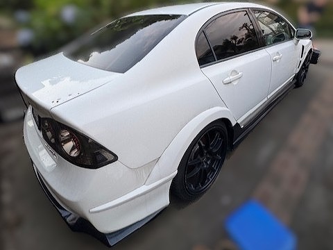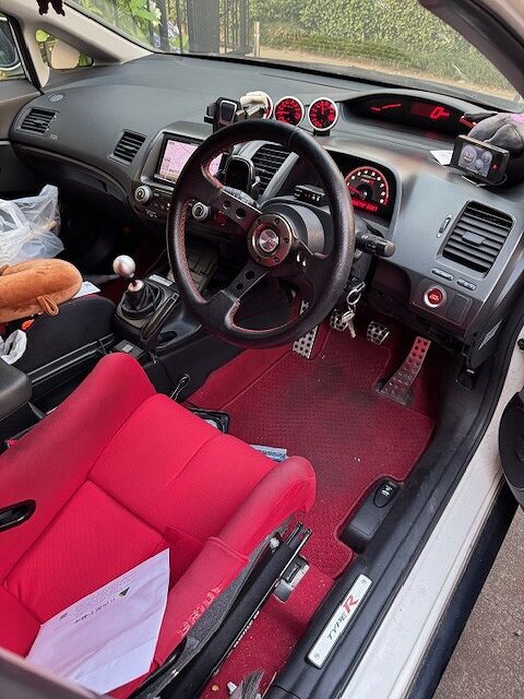 H20年式 シビック(FD2) タイプR 6速マニュアル 走行12.5万㎞H20年式、シビック(FD2)の改造車になります。エンジン関係はJ’sレーシングのエアクリーナー、3Q自動車のマフラーに交換し、J’sレーシングのECUで制御してあります。冷却対策として社外のアルミラジエターも装着されています。また、J’sレーシングの車高調、クスコのLSDで足回りや駆動系も強化してあります。外装はJ’sレーシング、イングス、ホンダツインカムなどのエアロパーツを組み、エンケイのPF01ホイールを履きドレスアップされています。内装もブリッドのフルバケ、デフィの追加メーター、社外のステアリングが組んであります。エアコンの調子が悪く、外装に色あせ、ウイング&カナードの外し穴などありましたが、しっかりチューニング&ドレスアップしてあるため高価買取できました。