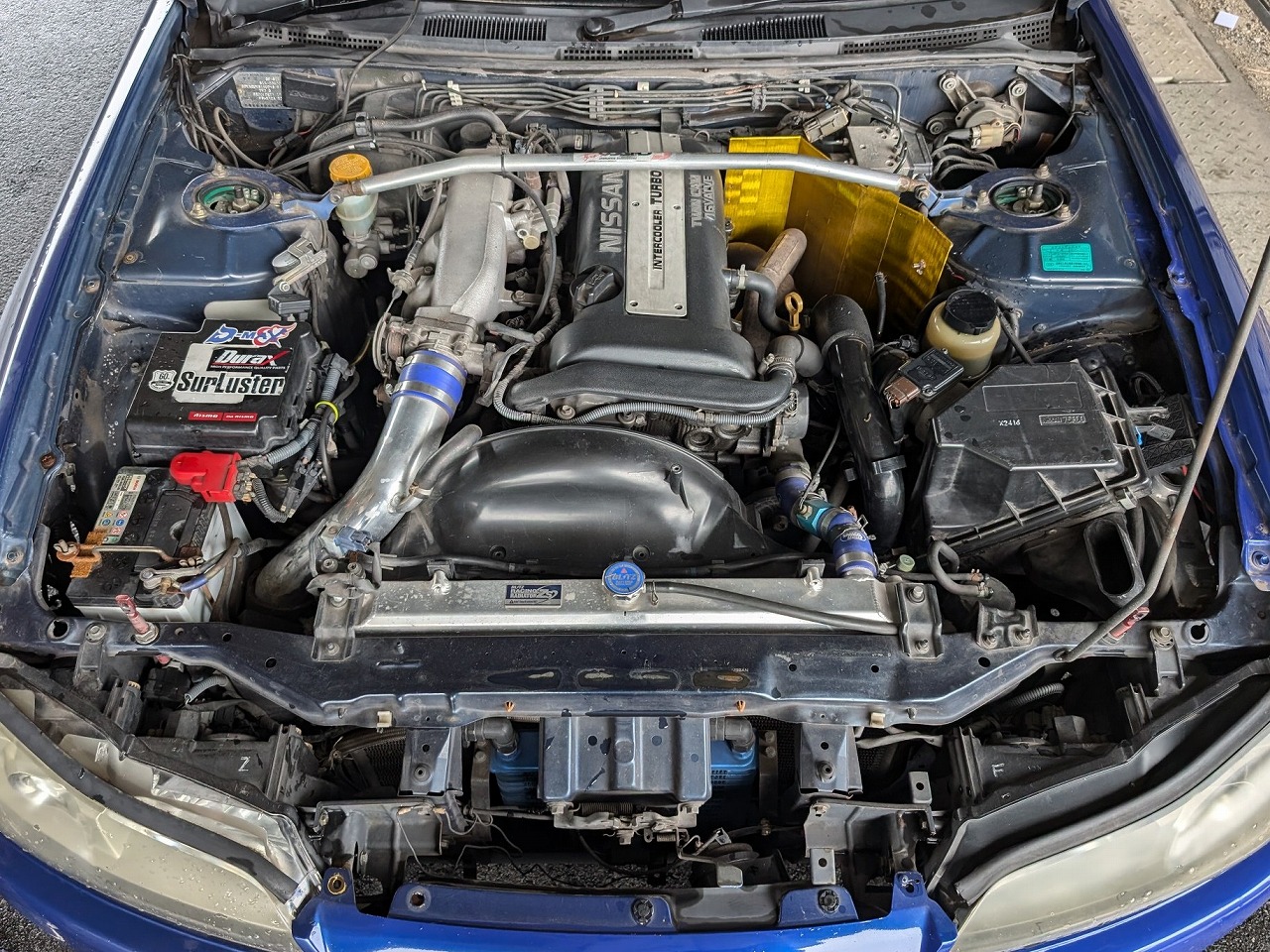 GT3-RSタービン/東名エキマニ/ブリッツインタークーラー/HPIアウトレット&フロントパイプ/HKSキャタライザー/社外マフラー/ブリッツラジエター/トラストオイルクーラー/ニスモLSD/テイン車高調/クスコスタビ/クスコトーコン&アッパーアーム/社外ボンネット/D-MAXテールランプ/スパルコバケットシート/社外ステアリング
