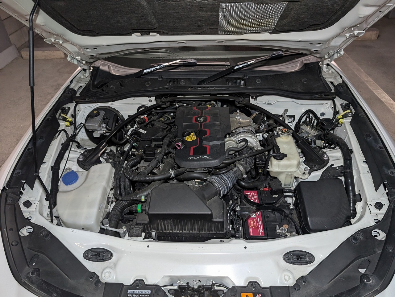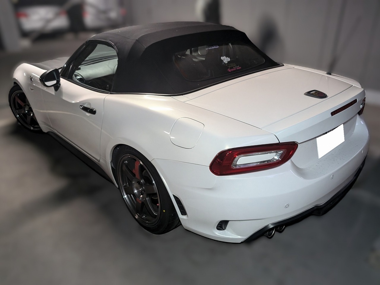 H29年式 アバルト124スパイダー(NF2EK) 6速マニュアル 走行6.9万㎞H29年式、走行6.9万㎞のアバルト124スパイダーのマニュアル車です。エンジンはレコードモンツァのマフラーに交換し、足回りはクスコの車高調、ボルクTE37ホイールが組んであります。ボディに少しキズがあり、ボンネットをラバースプレーで塗装してありましたが、まとまりのあるライトチューン車の高価買取できました。