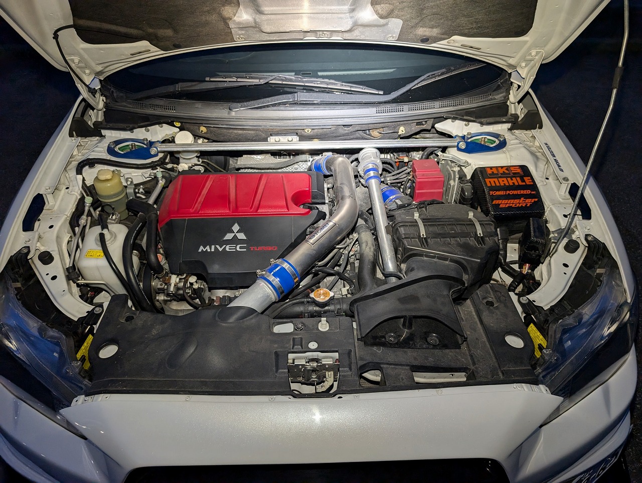 エンジンルーム内はクスコのタワーバーが装着されています。エンジン関係は東名のチタンインタークーラーパイプ、HKSのマフラーに交換されています。