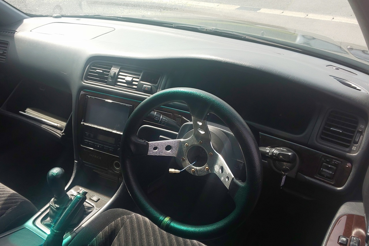 純正5速マニュアルでインテリアはステアリングが社外品に交換してある程度です。改造車買取専門CPSではマーク2、チェイサー、クレスタなどの即ドリ車を多く査定、買取しています。サーキット仕様、街乗り仕様など様々な仕様を高価買取‼北海道から沖縄県まで全国無料で出張査定を行っておりますので、チューニングカー、ドレスアップカーの改造車の売却をご検討されている方がいましたら、お気軽にお問合せ下さい♪