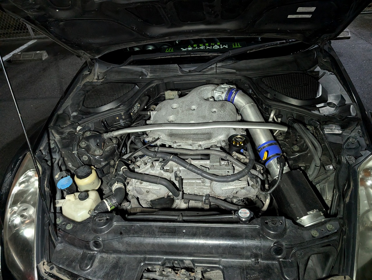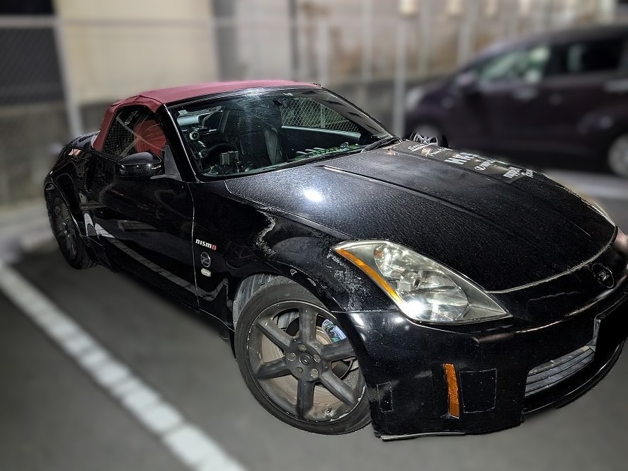 H16年式 フェアレディZ(HZ33) バージョンT 6速マニュアル 走行距離不明H16年式、フェアレディZ(HZ33)の改造車です。オートマからマニュアルに換装してあり、エンジンはお客様の申告になりますがオーバーホール後~4万㎞くらいで、ミナモトのエアクリ&サクションパイプ、インパルのエキマニ、サクラムのキャタライザー&マフラーに交換し吸排気チューンがしてあります。室内は社外のバケットシート、ステアリング、デフィの追加メーターなどが装着されています。走行距離、ボディに色あせ、電動幌の不良など不具合箇所が多数ありましたが、人気のパーツを使い改造されていたため、アフターパーツの価値を精一杯のプラスし買取しました。