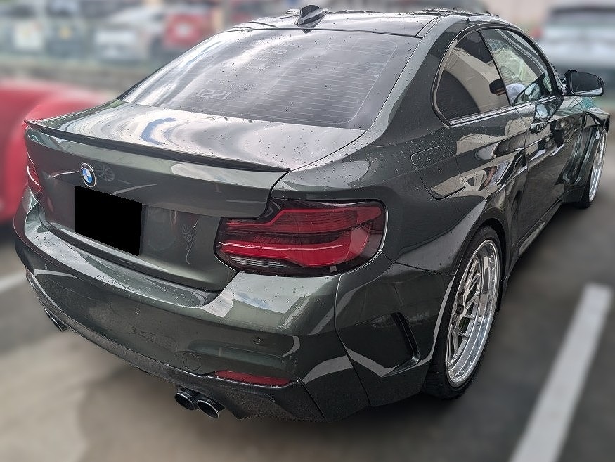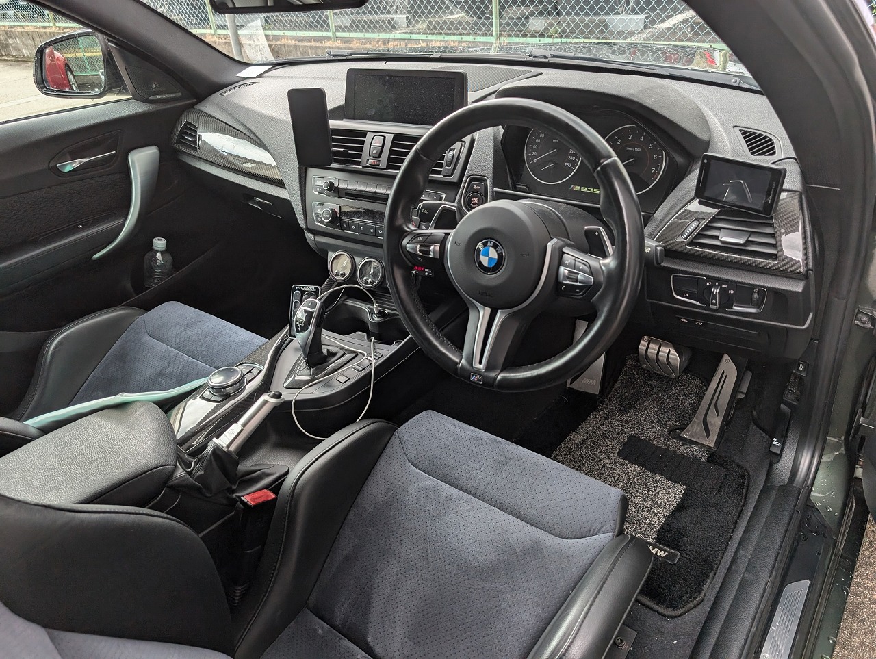 H26年式 BMWM235i(1J30) クーペ オートマ 走行7.4万㎞H26年式、BMWM235i(1J30)のカスタムカーになります。外装はグリーンにオールペンし、MANHARのワイドボディキットのほか3Dデザインのディフューザー、後期テールランプ、1221のホイールなどを組んであります。ほかにもアキュエアのエアサスやブレンボのキャリパーなども組んであり、内装はレカロのセミバケ、STACKの追加メーターなど装着されていて、スカッフプレートやステアリングはMスポーツ用に交換してあります。派手なスタイルに仕上げてあるBMWM235iは中古市場にあまり出回らないですが、カスタムした価値をプラス査定し買取しました。