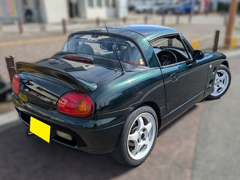 H4年式 カプチーノ(EA11R) 5速マニュアル 走行距離不明H4年式カプチーノ(EA11R)の改造車です。エンジンはモンスタースポーツのタービン&ECUに交換しパワーアップしてあり、足回りはブリッツの車高調、OZのホイールが組んであります。外装はコージーライツのフロントバンパー、トヨシマクラフトのボンネットを組みグリーンにオールペンしてあります。内装はナルディステアリンツ、デフィ追加メーター、RX-7(FD3S)純正シートなど装着されています。5桁メーターから6桁メーターに交換してあり交換履歴が残っていないため走行不明車でしたが、良いアフターパーツが装着されていたため頑張って買取しました。