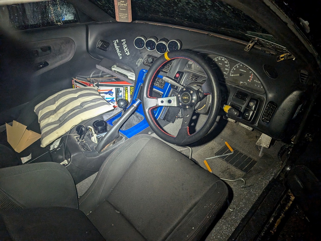 内装はダッシュボードに割れがなく、レカロのセミバケットシート、社外のステアリング、追加メーターなど装着されています。改造車買取専門CPSではシルビア、180SX、ツアラーVなどの即ドリ車を積極的に査定、買取しています。サーキット仕様、街乗り仕様、イベント仕様など様々な改造車を高価買取‼北海道から沖縄県まで全国無料で出張査定を行っておりますので、チューニングカー、ドレスアップカーのご売却をご検討されている方がいましたら、お気軽にお問合せ下さい♪
