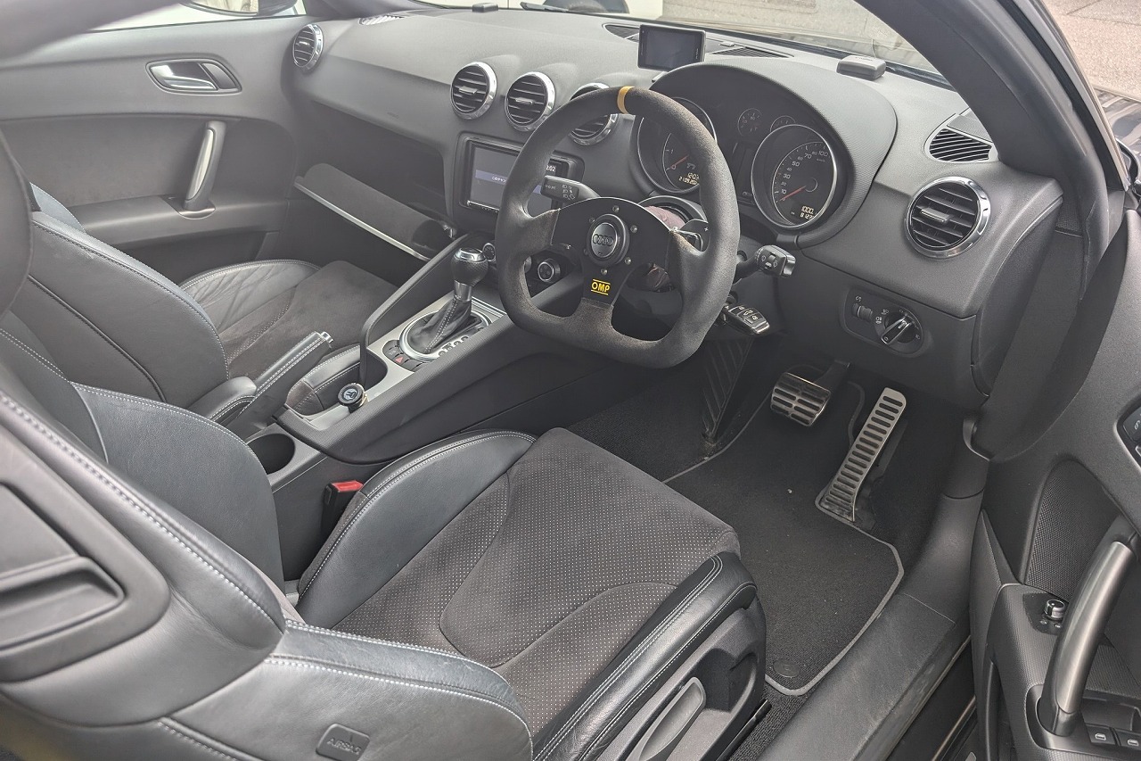 H26年式 アウディTT(8JCDA) 1.8TSFI Sラインコンペティション オートマ 走行8.1万㎞走行8.1万㎞のH26年式アウディTT(8JCDA)の改造車です。エンジン関係は置換タイプのエアクリーナーに交換しデジタルスピードのステージ1データをインストールしパワーアップしてあります。エンジンのほかにもKW車高調、エンドレスキャリパー、OZホイール、社外テールランプ、RSグリルなどを組みチューニング&ドレスアップされています。シンプルに仕上げたエクステリアで街乗りから高速走行まで快適にこなせる車のため、高価買取できました。