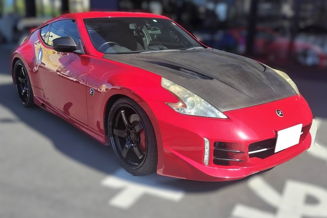 H25年式 フェアレディZ(Z34) バージョンS 6速マニュアル 走行15.0万㎞1オーナー車のH25年式フェアレディZ(Z34)の6速マニュアル車をベースにした改造車です。エンジンはニスモのフロントパイプ、アミューズのフルチタンマフラーに交換されていて、ニスモのクラッチ、HKSの車高調で足回り、駆動系を強化してあります。外装はセントラル20&インパルのエアロ、フジムラオートのボンネット、バリスのウイングを装着しアドバンGTの20インチホイールを履いています。内装は15万㎞のわりに状態が良く、運転席をレカロのフルバケットシートに交換されています。マニュアルのZ34は台数が少なく、しっかりチューニング&ドレスアップしてある車のため、高価買取できました。