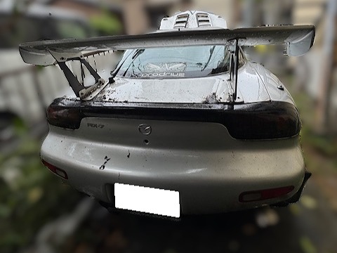 H10年式 RX-7(FD3S) タイプRS 5速マニュアル 走行7.6万㎞H10年式、RX-7(FD3S)、タイプRSをベースにした改造車です。エンジンはHKSのエアクリーナー、RE雨宮のVマウント、キャタライザー、マフラーに交換しパワーFCでセッティングしてあります。足回りにはDG5の車高調が組んであり、駆動系も強化クラッチ、社外のLSDが組んであります。外装はRE雨宮のエアロが組んであり、内装もレカロのバケットシート、デフィの追加メーター、RE雨宮のステアリングなどが装着されています。数年エンジンを掛けるくらいで走行することはなかったようで、ボディに色あせ、錆などありましたが、人気のパーツが多数装着してあったためパーツの価値も含め買取できました。