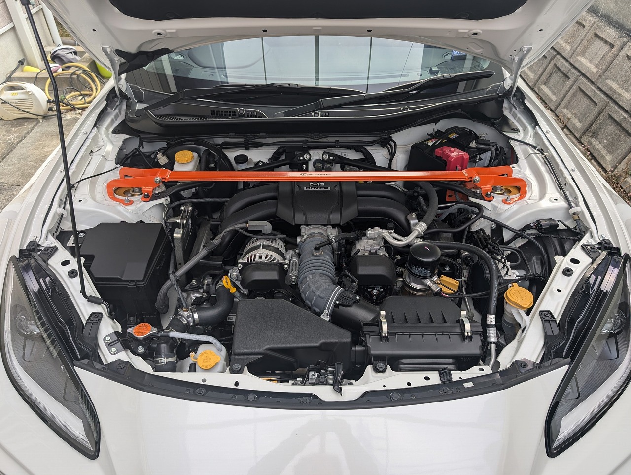 走行6千㎞でクールレーシングのマフラーに交換されています。エンジンルーム内にクールレーシングのタワーバーが装着されています。