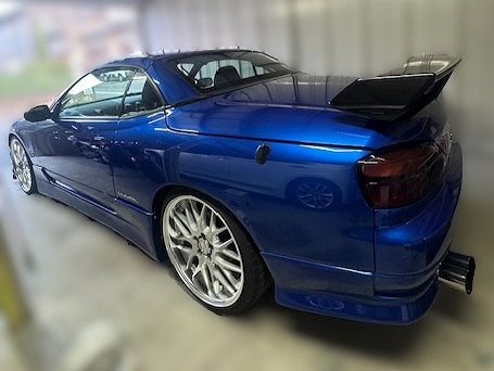 H13年式 シルビア(S15) ヴァリエッタ 5速マニュアル 走行6.1万㎞H13年式、シルビア(S15)、ヴァリエッタをベースにした改造車です。NAエンジンからGT4135タービンなどを組んだターボエンジンに換装し、FコンVプロでセッティングしてあり、足回りには車高調が組んであります。外装は傷など少なく社外リップ、社外ウイング、ワークの19インチホイールなどを組みドレスアップしてあります。内装はトラストのステアリング、アペックスのブースト計が装着されています。フロントまわりに修復歴がありましたが、内外装、機関の程度の良いため車としての価値が高く、しっかり改造してあるため高価買取できました。