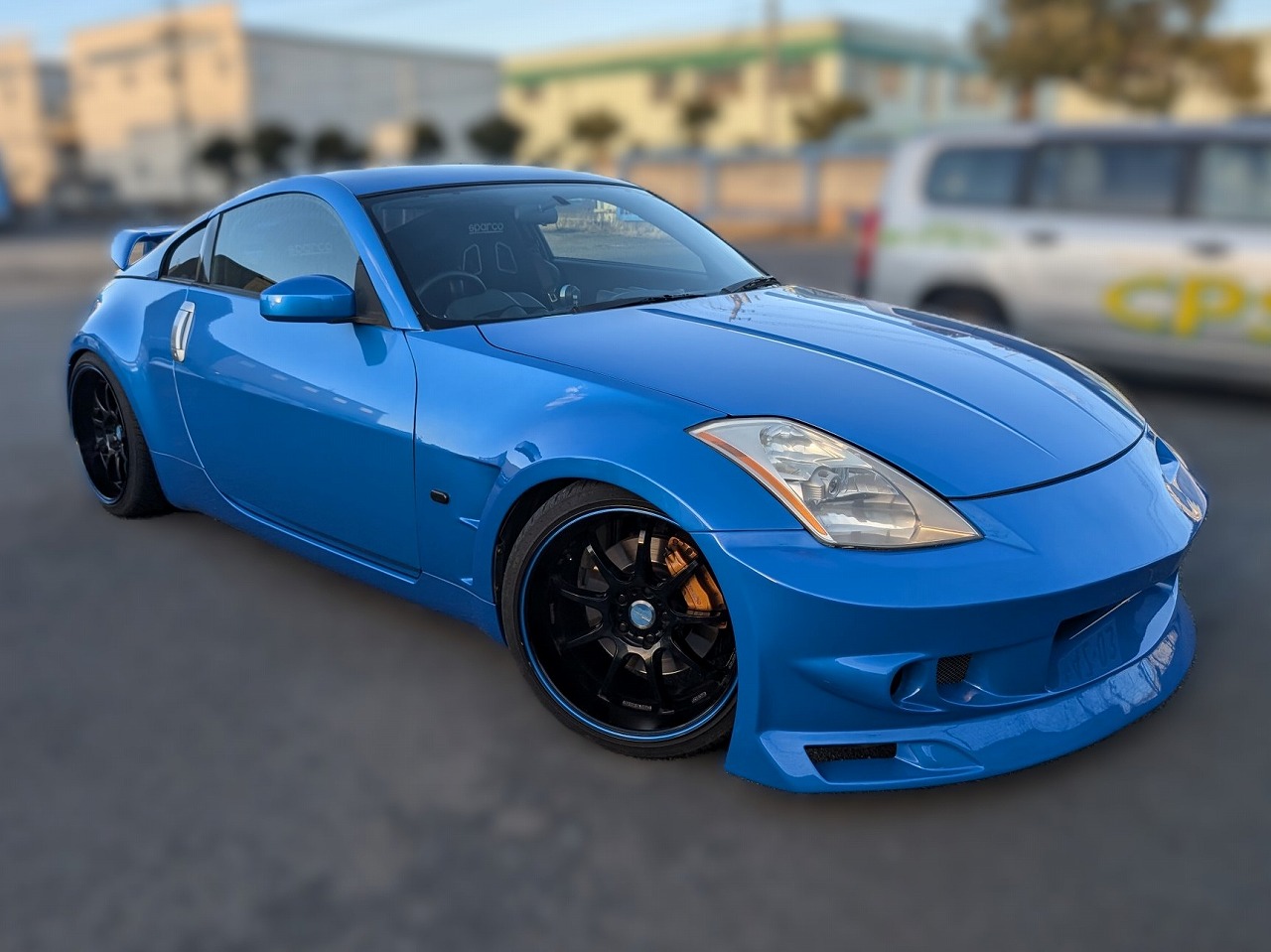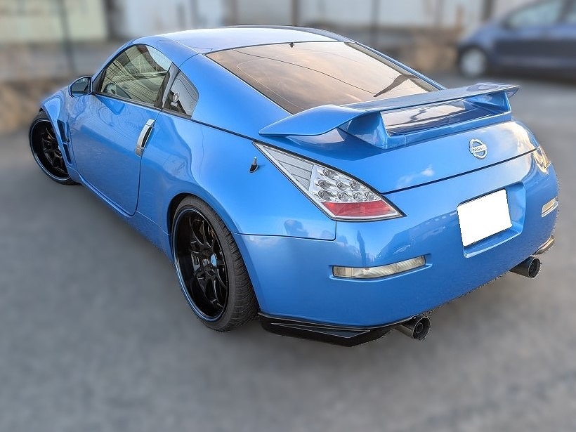 H16年式、マニュアル車のフェアレディZ(Z33)の改造車です。エンジンはエアクリーナー、サクションパイプ、マフラーを社外品に交換してあり、足回りはHKSの車高調が組んであります。外装は社外のエアロパーツを組みブルーにオールペンしてあり、ワークのホイールを履いています。内装はスパルコのバケットシート2脚、ZSSのステアリングに交換されています。吸排気、足回りチューンし、外装もセンス良くドレスアップしてある改造車のため精一杯の金額をご提示し買取しました。