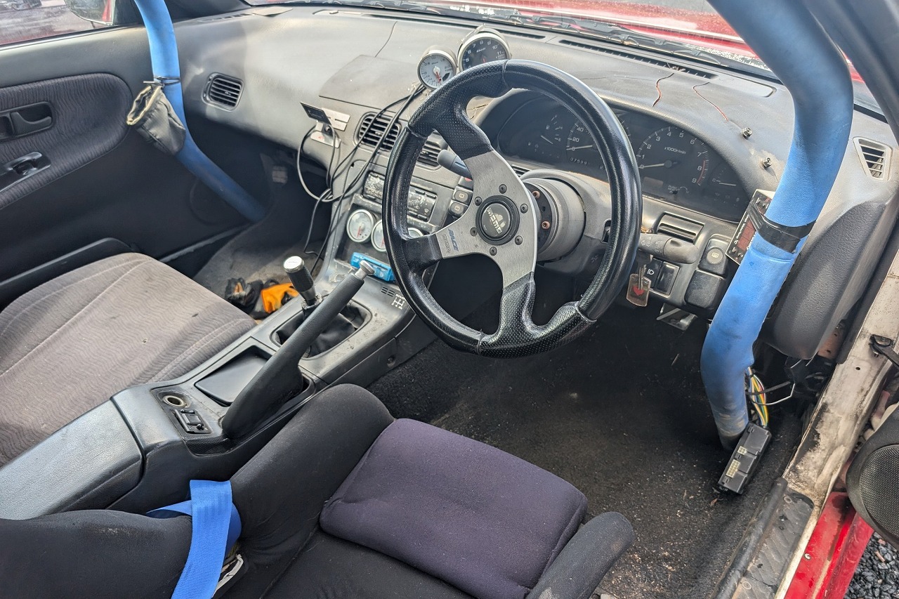 ダッシュボードにひび割れがありますが、レカロフルバケ、ロールバー、トラスト追加メーターなどサーキット走行に必要なパーツが装着されています。