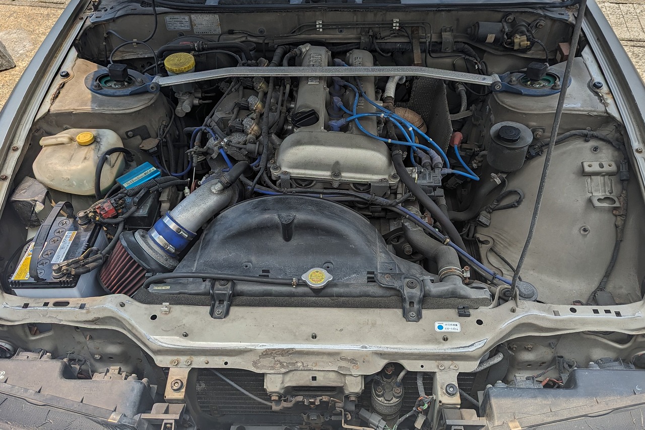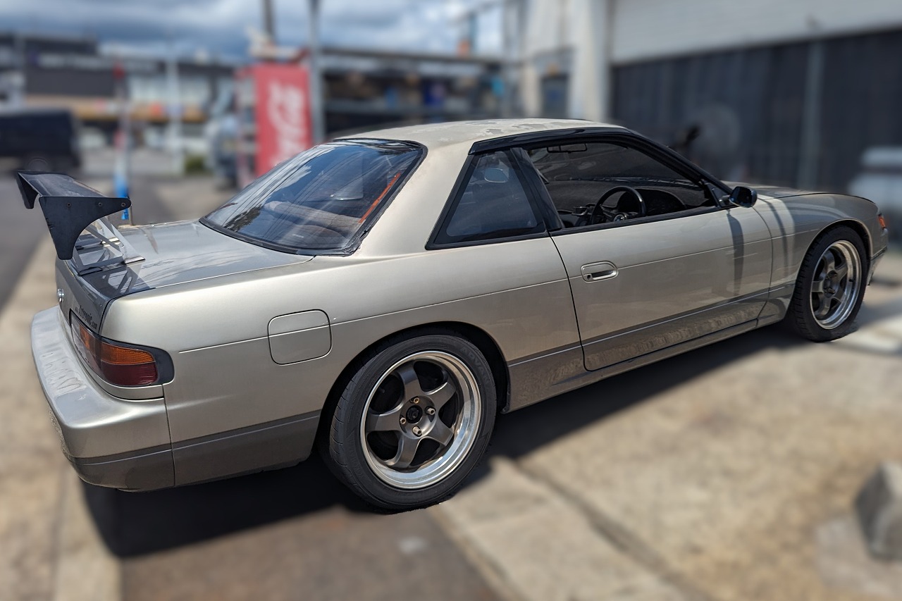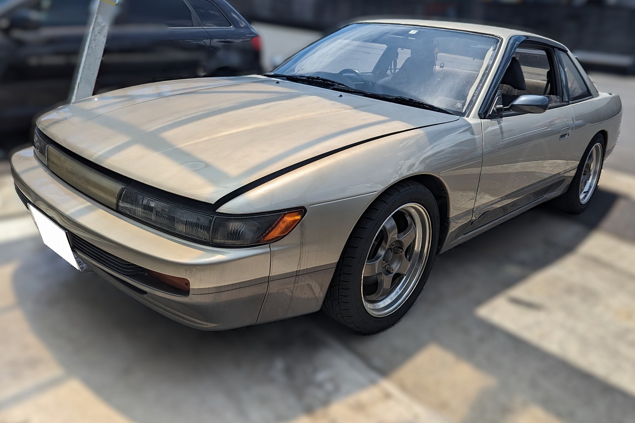 H5年式 シルビア(PS13) Q‘s 5速マニュアル 走行31.9万㎞走行30万㎞オーバーのNAシルビア(PS13)の改造車です。エンジンは東名のキットを使い2.2LにボアアップしFコンVプロを使いエアフロレス化しセッティングしてあります。駆動系はエクセディクラッチ、クスコLSD、足回りはテイン車高調、クスコテンションロッド、リヤアッパーアーム、トーコンなど組んであり、ホイールはワークマイスターS1を履いています。内装もナルディステアリング、ブリッドフルバケなど装着されています。外装に傷、色あせなどありますが、チューニングしてある価値をプラス査定し買取しました。
