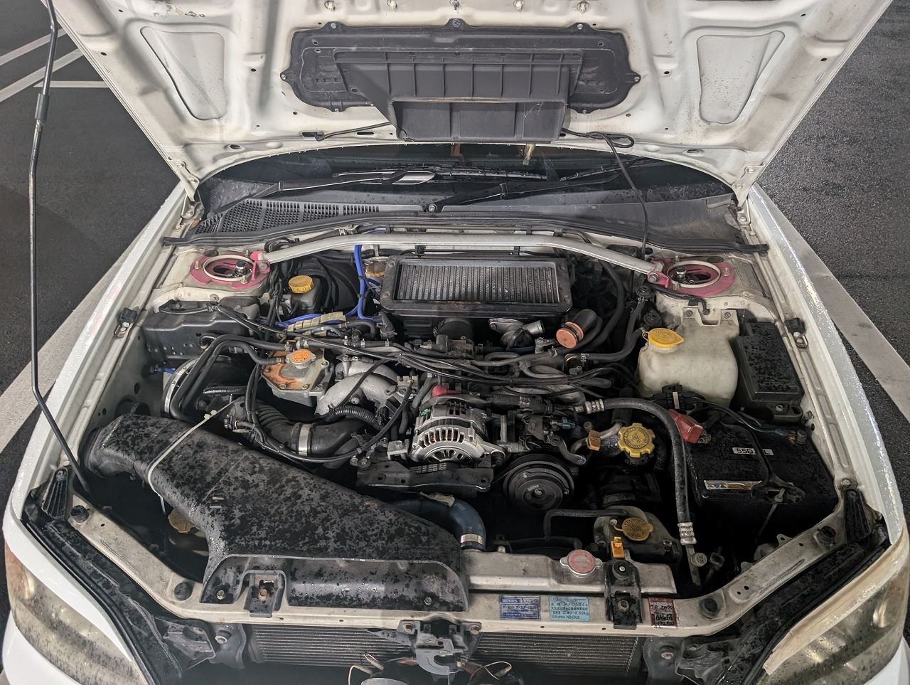 ブリッツエアクリーナー/柿本マフラー/社外ラジエター/ラルグス車高調/スキッドレーシングトーコン/メーガンレーシングリヤアッパーアーム/社外フロントハーフバンパー/リベラルサイドステップ&リヤハーフバンパー&グリル/インプレッサ(GVB)ウイング/スタンスネーションホイール/ピボット追加メーター
