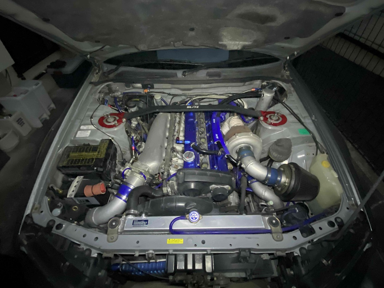 RB26ブロックを使い2.6L化し社外タービンを組みリンクG4ECUで制御してあります。ラジエター、オイルクーラーも装着されています。