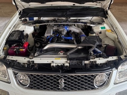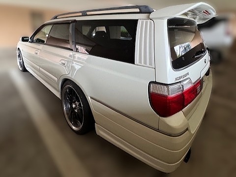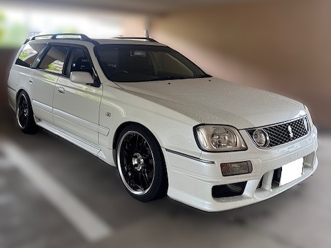 H13年式 ステージア(WGC34改) 25tRSVエアロパッケージ 5速マニュアル 走行8.8万㎞H13年式、ステージア(WGC34)のマニュアル車でエンジンをはじめ多数チューニングしてあります。エンジンは東名のステップ2カム、メタルヘッドガスケットを組みトラストのT620zタービンを組み合わせてパワーFCで制御してあります。駆動系はER34ミッションを使いマニュアル化してあり機械式LSDも組んであり、足回りはファイナルコネクション車高調、ブレーキにはER34キャリパーが組んであります。外装は純正オプションのデイズのバンパーやウイングを組みボルクGT-Vホイールを履いています。走行距離が即なく内外装、機関良好な改造車のため精一杯頑張り高価買取しました。