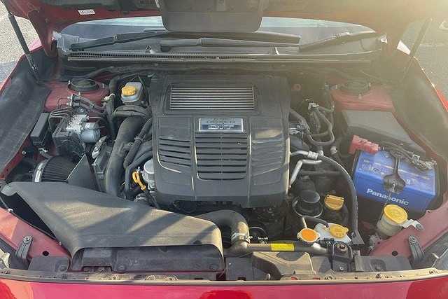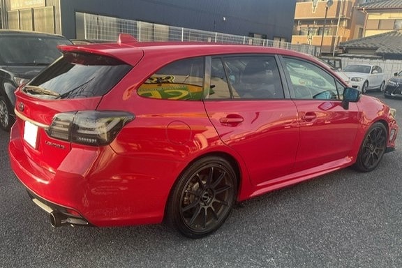 走行12.4万㎞、H26年式、レヴォーグ(VM4)をベースにした改造車です。エンジンは社外エアクリ、HKSマフラーに交換し吸排気チューンを施し、足回りにはHKSの車高調が組んであります。外装はダムドのフロントバンパーにホムラ19インチホイールを合わせドレスアップしてあります。内装もボディカラーに合わせた赤/黒のシートカバーが装着してあり、内外装のバランスも良いです。