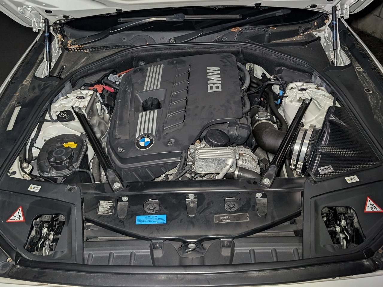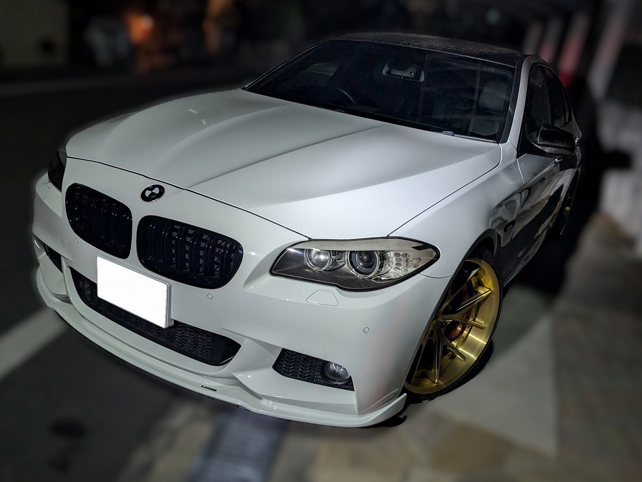 H24年式 BMW528i(FR30) Mスポーツパッケージ オートマ 走行7.2万㎞H24年式、右ハンドルのBMW528i(FR30)のカスタムカーです。走行距離は7.2万㎞でグループMのエアクリ、レムスのマフラーに交換し吸排気チューンが施されています。エンジン関係のほかにも車高調、ブレンボキャリパーも組んであります。内装はノーマルですが外装はハーマンのフロントリップ、3Dデザインのウイング&リヤディフューザー、ハイバーフォジドのホイールなどでドレスアップしてあります。ルーフに施工されたカーボンラッピングに劣化がありましたが、バランスよくカスタムされていたので高価買取できました。