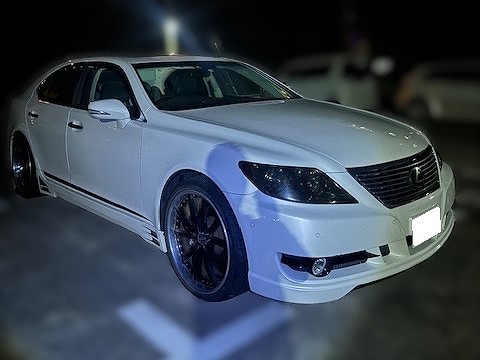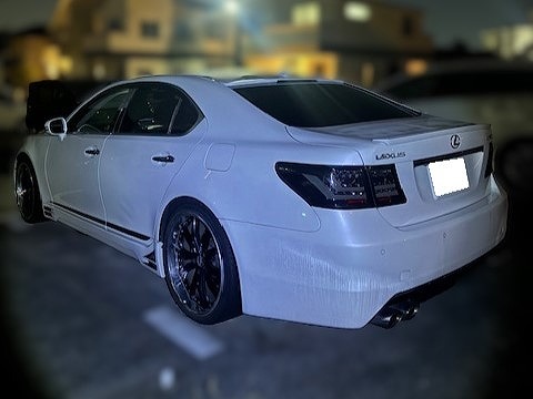 H20年式 レクサスLS460(USF40) バージョンUIパッケージ オートマ 走行9.1万㎞サンルーフ、黒革シートのレクサスLS460(USF40)をベースにしたドレスアップカーです。外装をメインにカスタムしてあり、社外エアロ(フロントバンパー/サイドステップ/リヤバンパー/ルーフスポイラー/ウイング)、クレンツェ21インチホイールを組み、エアサスコントローラ―を使いローダウンしてあります。H20年式で走行9万㎞で、エアロ割れ、小傷などありましたが、ドレスアップしている価値を付けて買取しした。