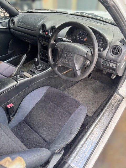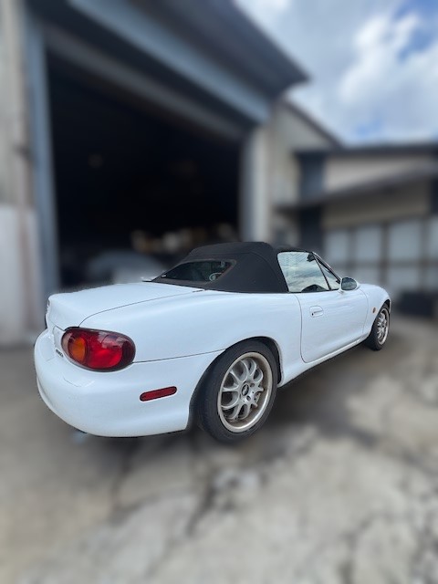 H11年式 ロードスター(NB6C) スペシャルPKG 5速マニュアル 走行24.1万㎞H11年式、ロードスター(NB6C)の5速マニュアル車です。 エンジン関係は、マキシムワークスのエキマニが装着され、NAらしい吹け上がりの良さとサウンドを楽しめる仕様になっています。 足回り関係は純正のビルシュタインショックにオートエグゼのローダウンサスを組み、社外の15インチアルミホイールを履くことで、街乗りからワインディングまで扱いやすくなっています。 また、外装に関してはオレンジからホワイトへオールペイントされています。 走行距離が多く、内外装の状態は年式相応の使用感が見られましたが、簡単な補修でまだまだ活躍できそうな車の為、精一杯頑張り買取させていただきました。
