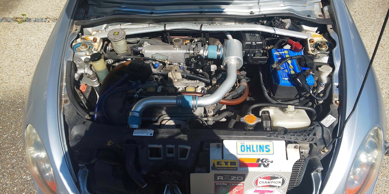 社外インテークパイプ/社外マフラー/オイルキャッチタンク/パルスピードCPU/ブリッツブーストコントローラー/ATオイルクーラー/オーリンズ車高調/社外タワーバー/Dスポーツトランクバー/ボルクCE28Nホイール/