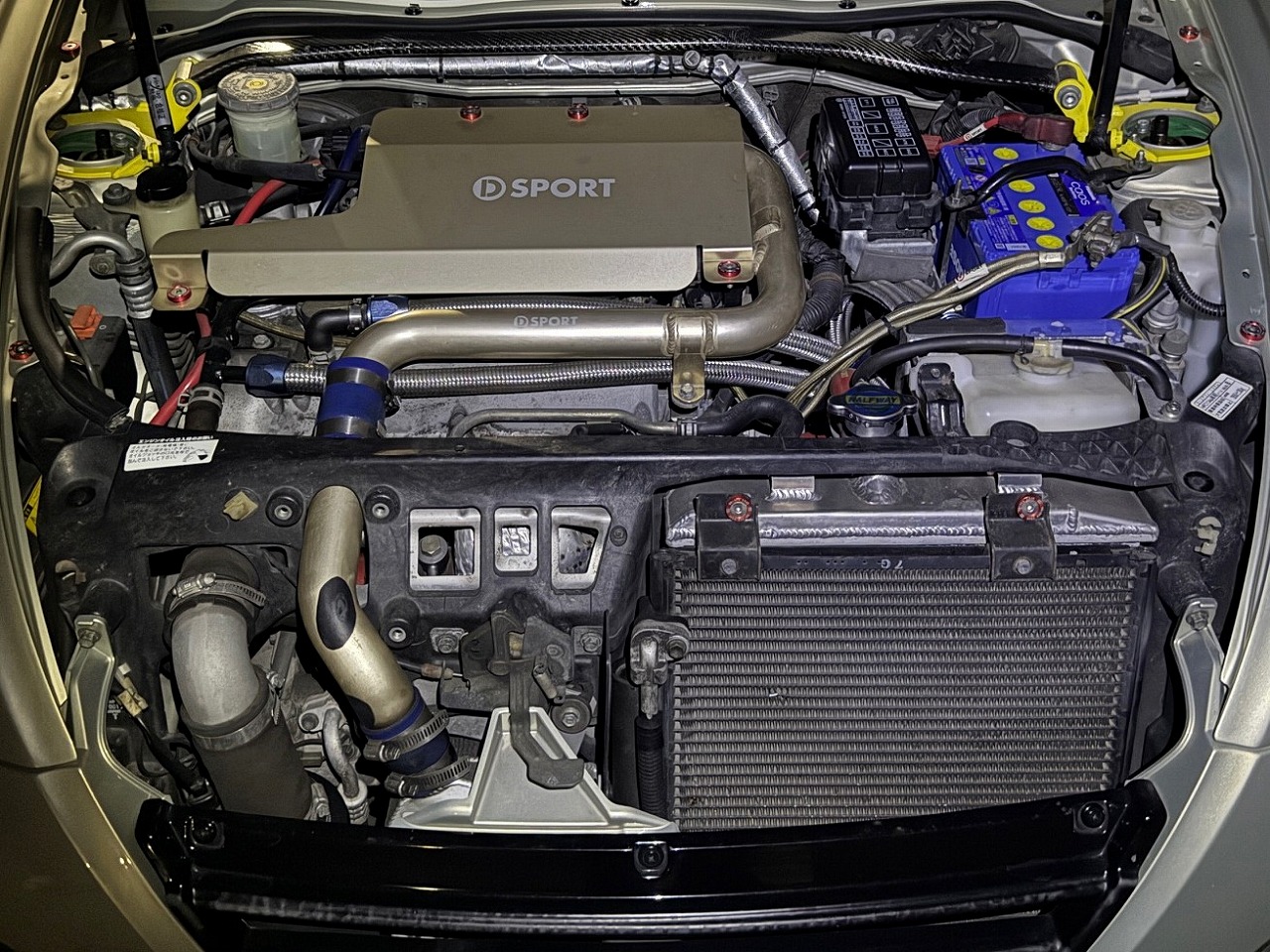 K&Nエアクリーナー/Dスポーツインタークーラー/ハーフウェイラジエター/Dスポーツマフラー/DスポーツECU/ブリッツブーストコントローラー/テイン車高調/Dスポーツタワーバー/Dスポーツ補強パーツ/ボルクCE28ホイール/ピボット追加メーター/ブリッドバケットシート/MOMOステアリング