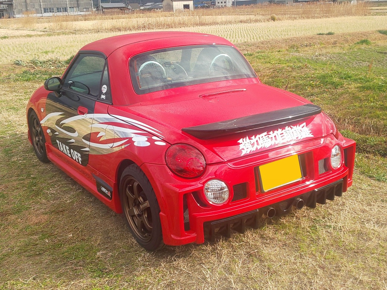 テイクオフのエアロパーツを組み赤にオールペン、バイナルを施工しテイクオフのデモカールックに仕上げたコパン(L880K)です。HKSエアクリ、柿本中間パイプ、Dスポーツマフラーを装着し吸排気チューンを施し、足回りはブリッツ車高調、ボルクTE37ホイールを履いて仕上げてあります。内装もMOMOステアリング、アルティメッドエディションのレカロシートが装着してあり、拘りのあるチューニング&ドレスアップが施された改造車です。