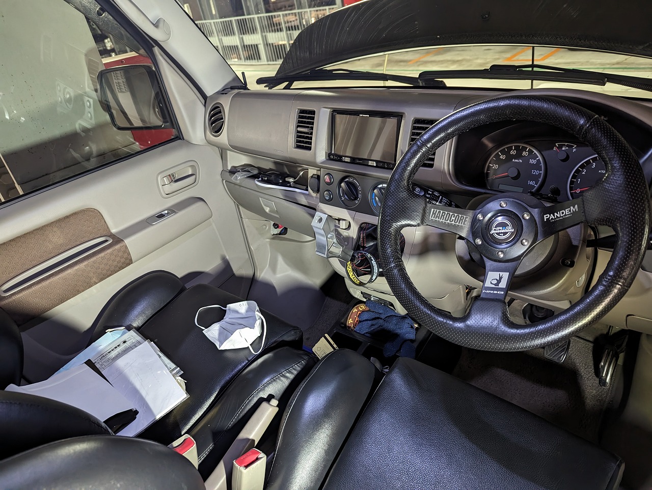 エブリィバン(DA64V)のターボをベースにした改造車です。11インチリフトアップ、オーバーフェンダーを装着し普通車登録してあります。エンジン関係は零1000パワーチャンバー、社外マフラーが装着してあり、内装もレカロシート、社外ステアリングに交換してあります。迫力あるスタイルに仕上げてあったため、改造した価値をプラスし査定買取できました。