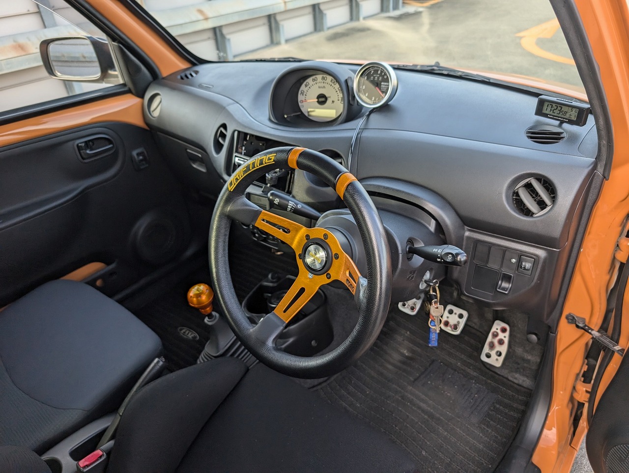純正のスピードメーター横にピボットのタコメーターが装着されていて、MOMOステアリング、レカロのバケットシートに交換されています。