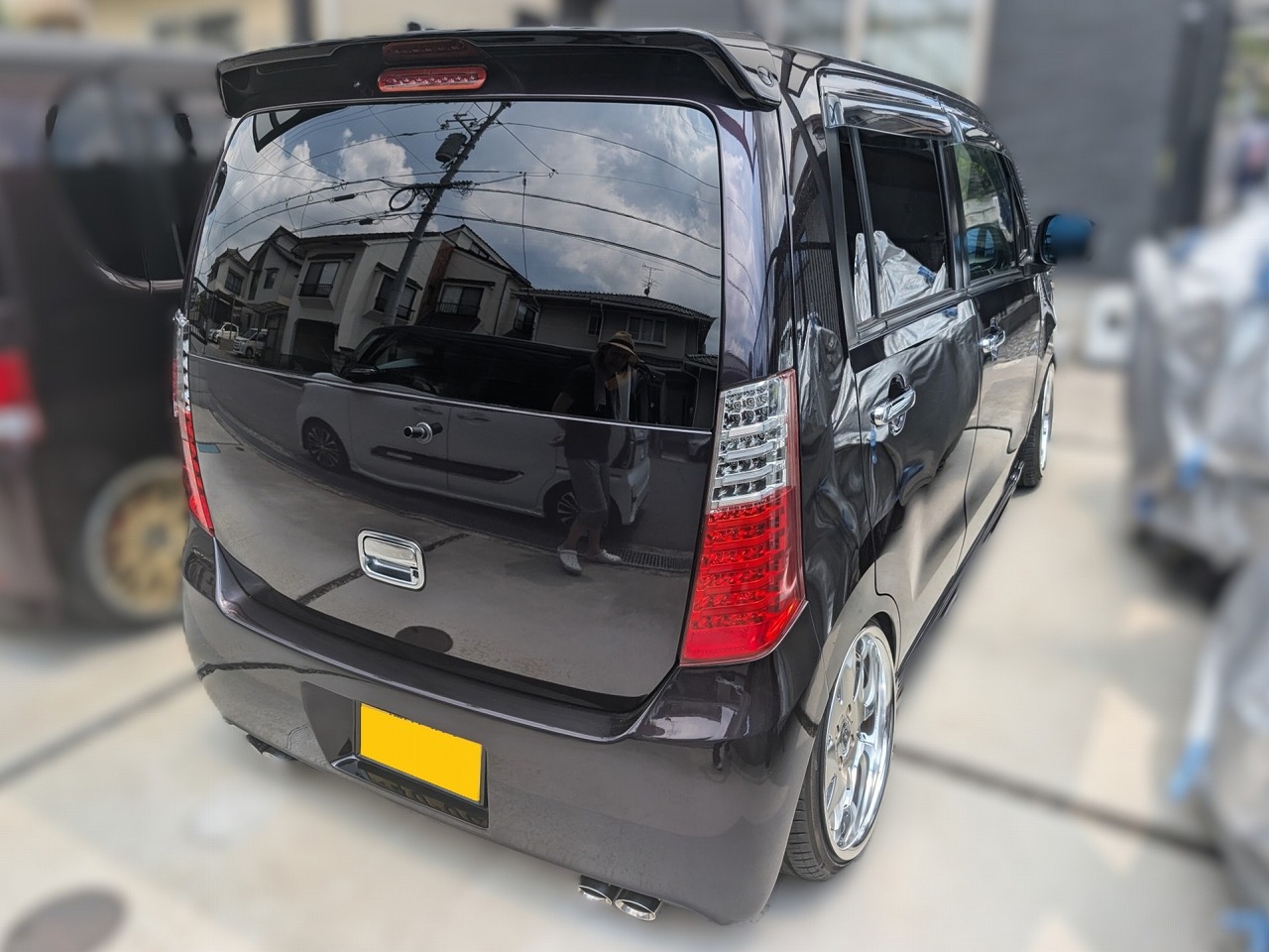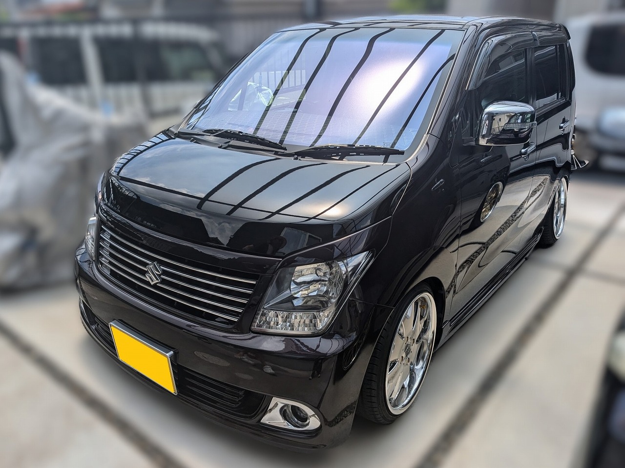 H24年式 ワゴンR(MH23S) リミテッド2 オートマ 走行1.6万㎞H24年式、走行1.6万㎞のワゴンR(MH23S)のカスタムカーで、昨日紹介したタントの同じお客様から買取しました。外装はルーフ、ボンネットをブラックにペイントしモードパルファムのエアロ、クラブリネアのホイールを履いています。足回りはシュピーゲルの車高調とJラインのアクスルに交換してあり、アクスルは非公認でした。内装はパネル類をピアノブラックに塗装してあり、グレイスのシートカバーやカロッツェリアのナビなどが装着してあります。1オーナー車で走行1.6万㎞とベース車の状態が良く、センス良くカスタムされていたため精一杯の金額をご提示し買取しました。