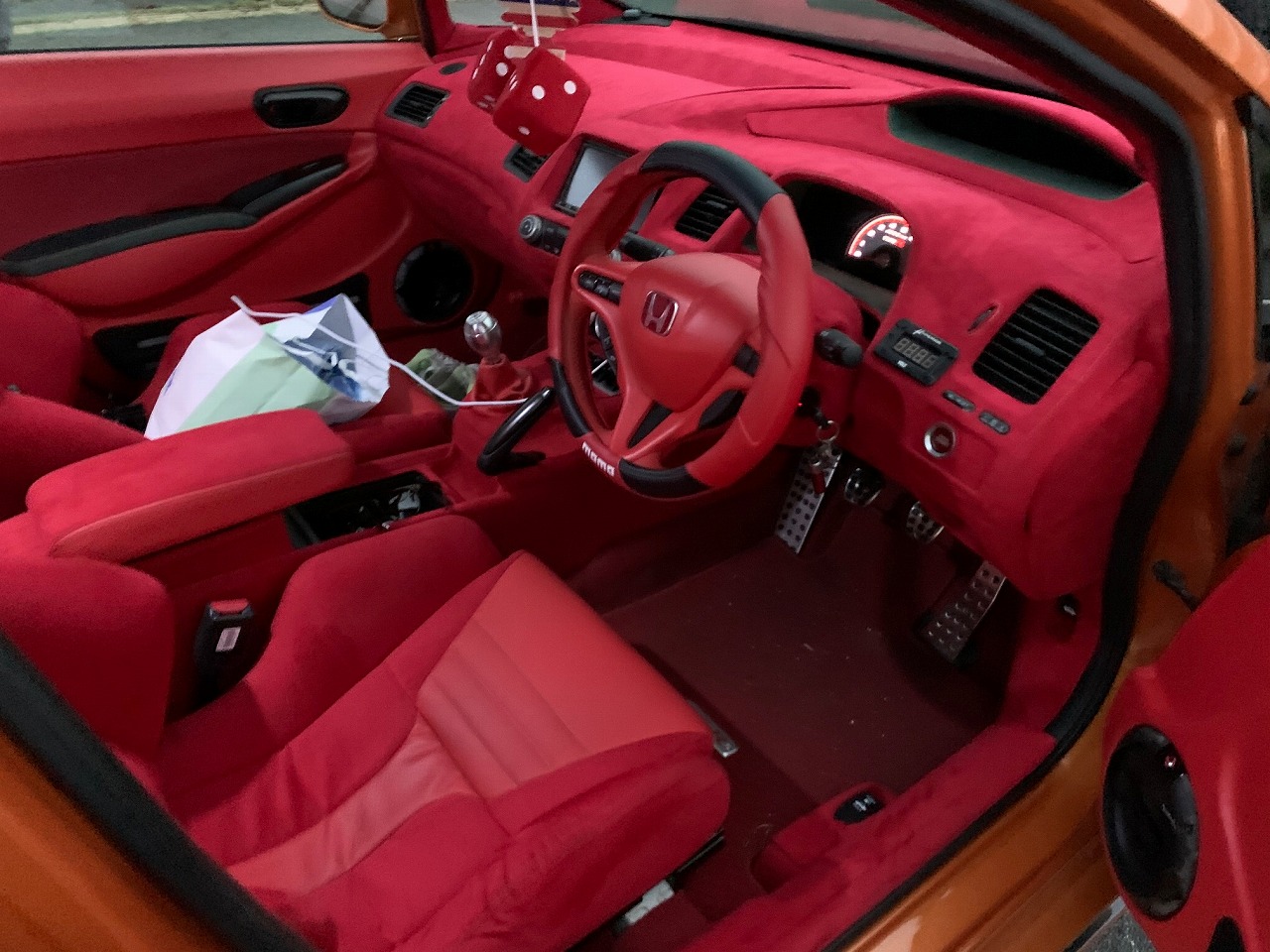 内装や外装は派手に作られており、赤とオレンジでまとまってます。エアサスを取り付けし公認を取られていない車両でも問題なく買取できますので是非ご連絡ください。