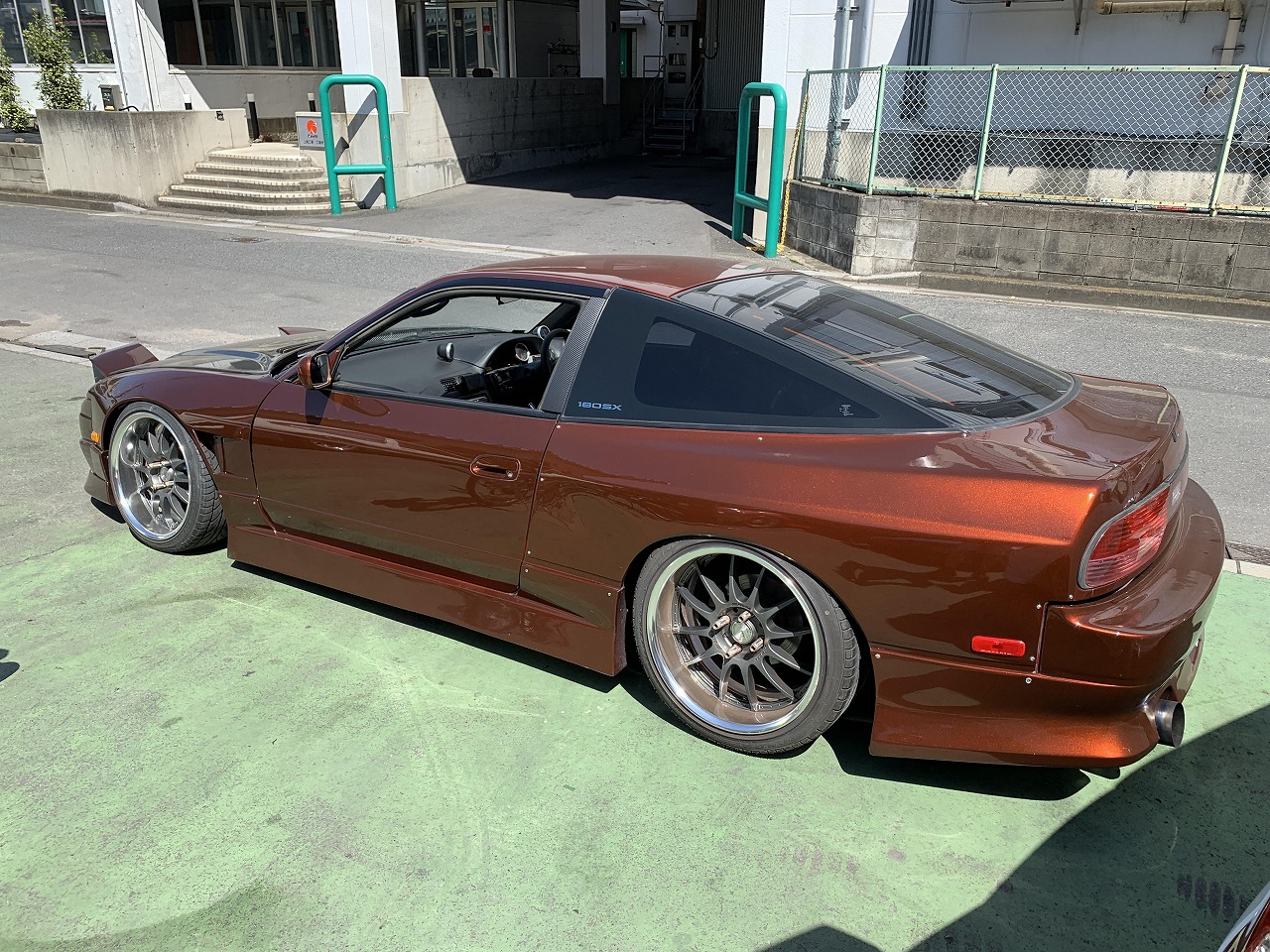 ブラウンメタリックにオールペンし、純正後期タイプフロントバンパー、ユーラスサイドステップ、リアバンパー、オリジンボンネット、前後ワイドフェンダー、ワーク戦18インチホイールなどを組み一目でドリフト仕様とわかるスポーティな雰囲気に仕上げてあります。