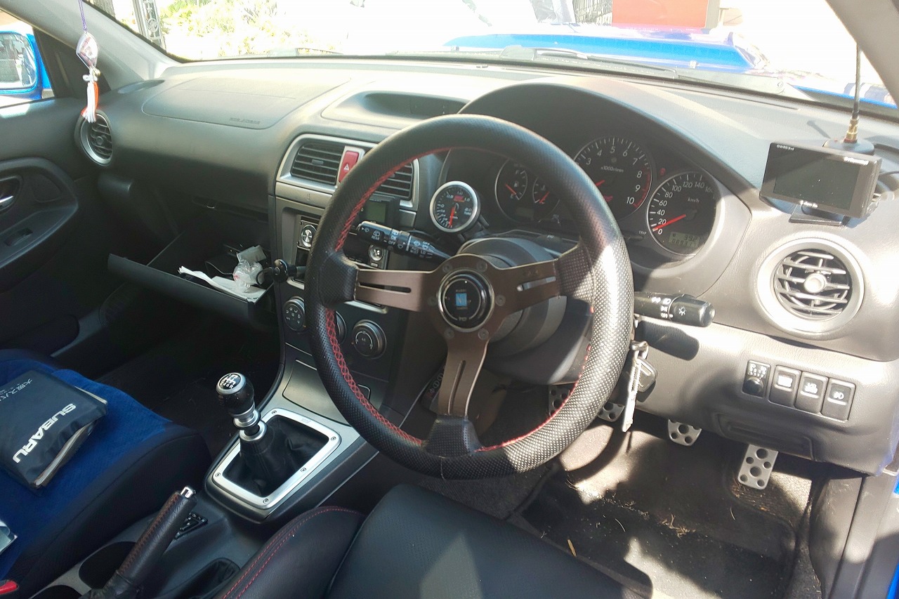 室内はブリッドフルバケ、ナルディステアリング、STi追加メーターなどが装着してあります。